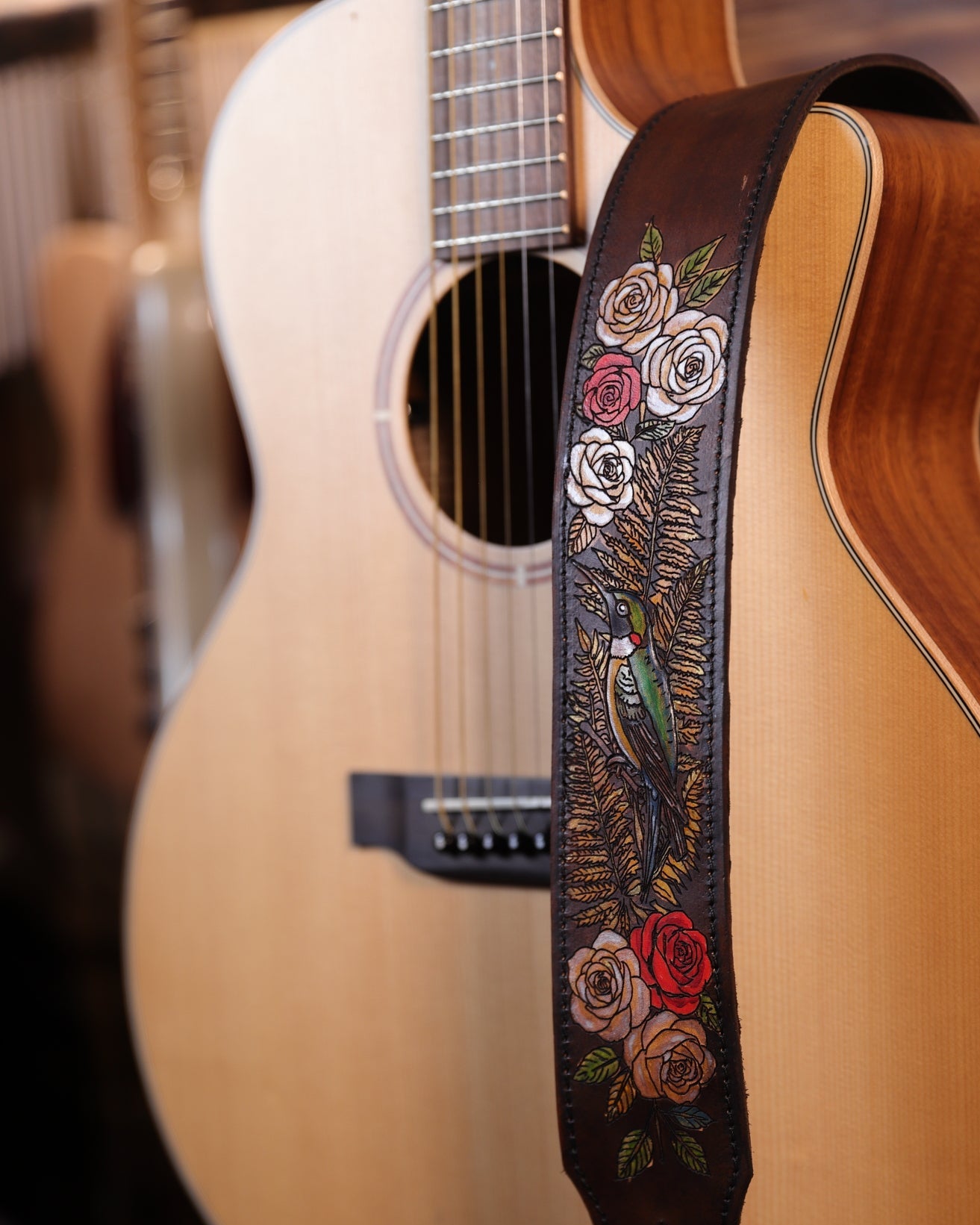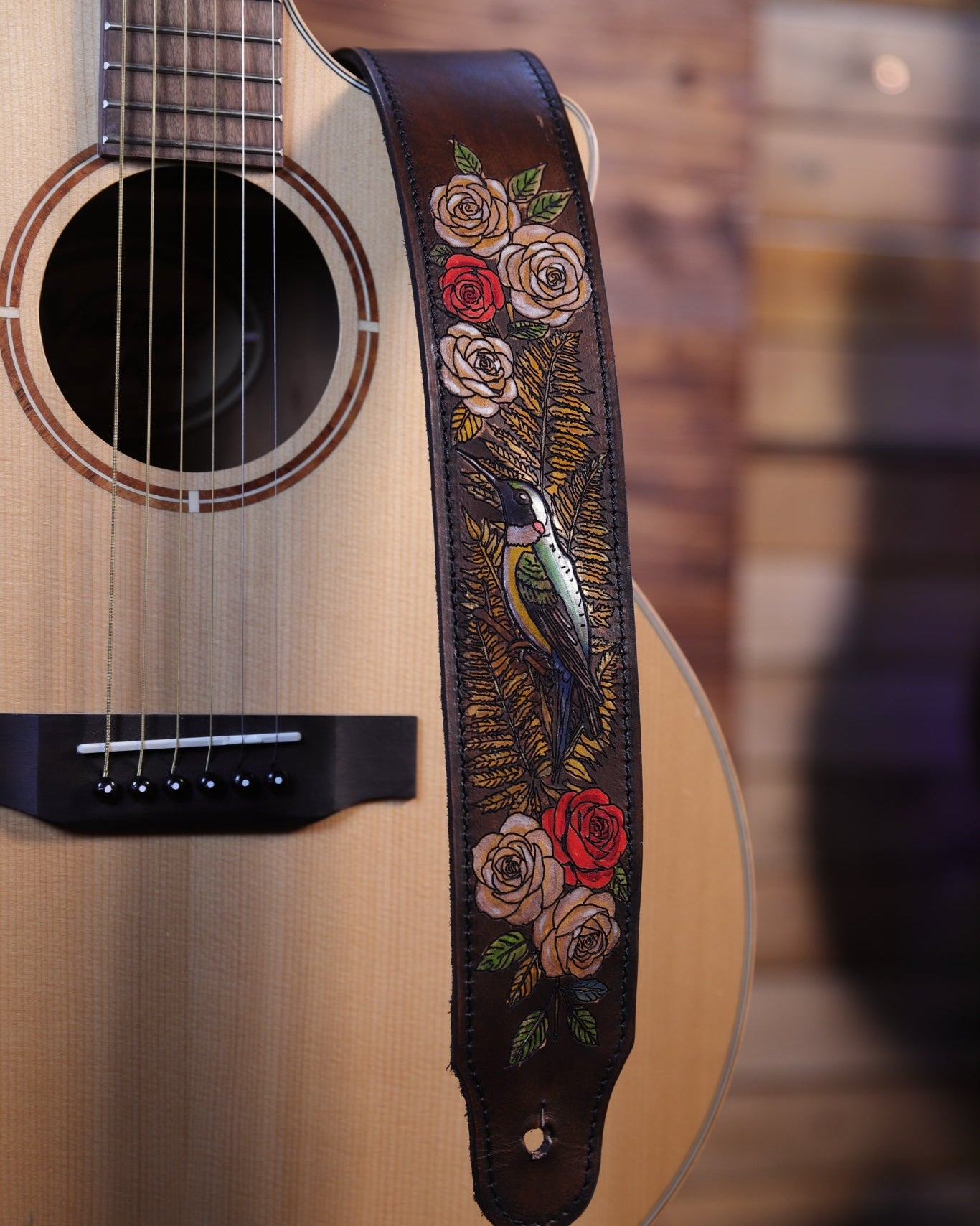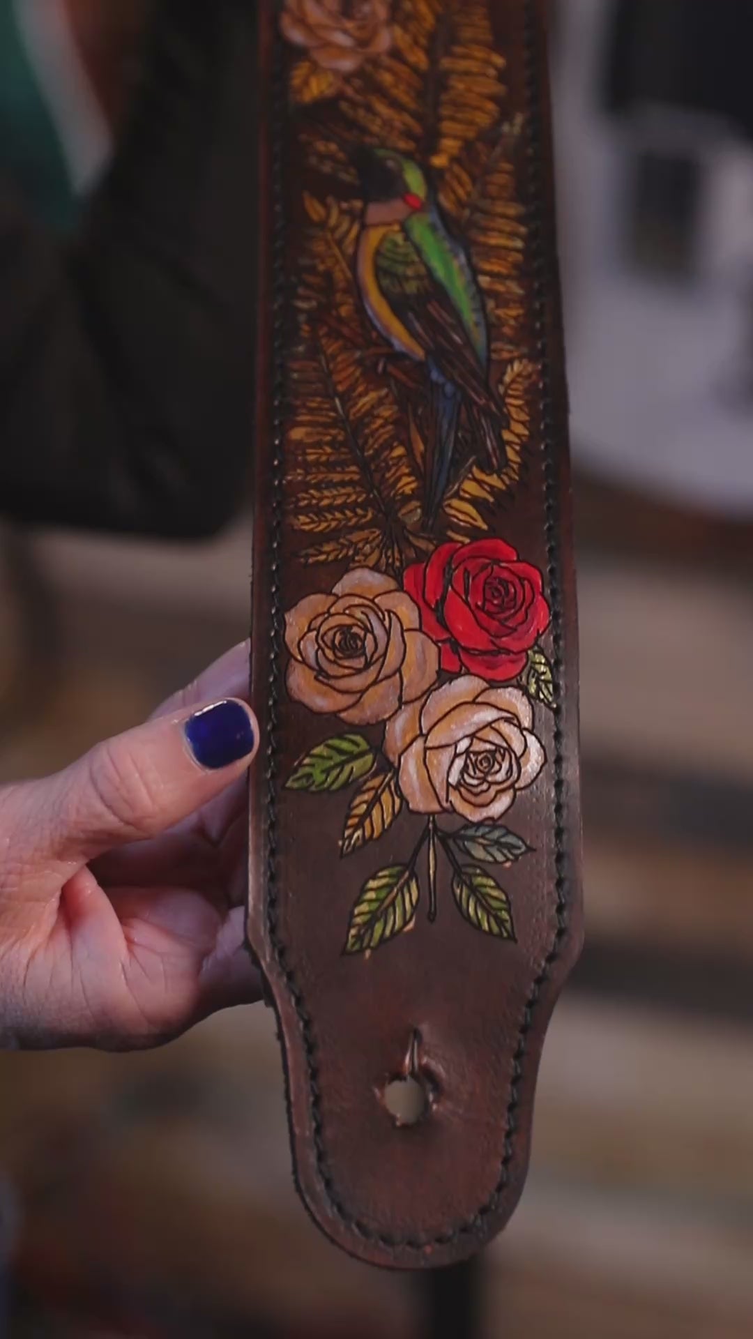 • Signature 3D hummingbird: Slighly elevated and hand-painted using my own artistic leather-working technique